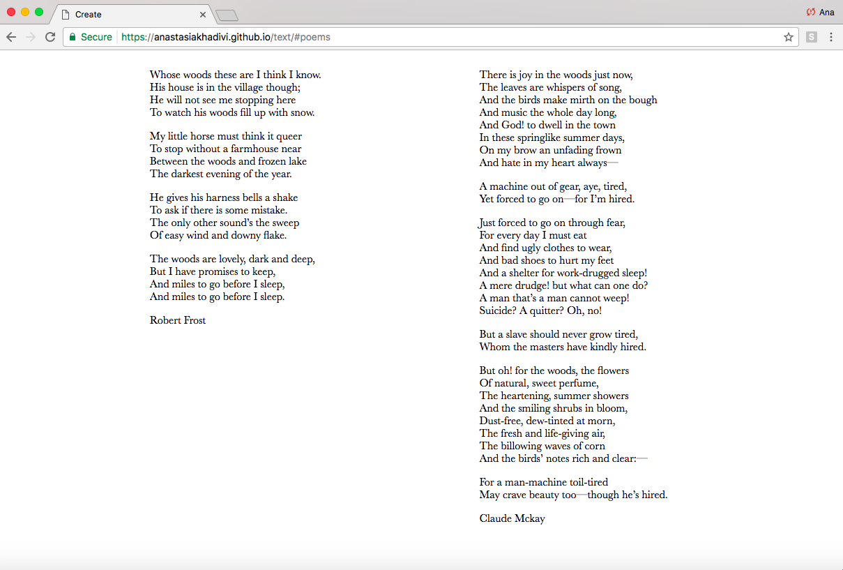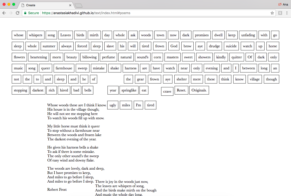 When the “Reset.” button is clicked, all the words that have been moved by the user, jump back to their original place. By clicking “Originals.”, the page displays the sources that the words in the word bank come from. It’s here that the user discovers that they come from poems by Robert Frost and Claude McKay. These set poems are also draggable and can be used by the user for their creation. From here, the word bank can still be found at the top of the page.