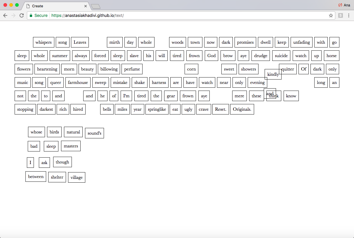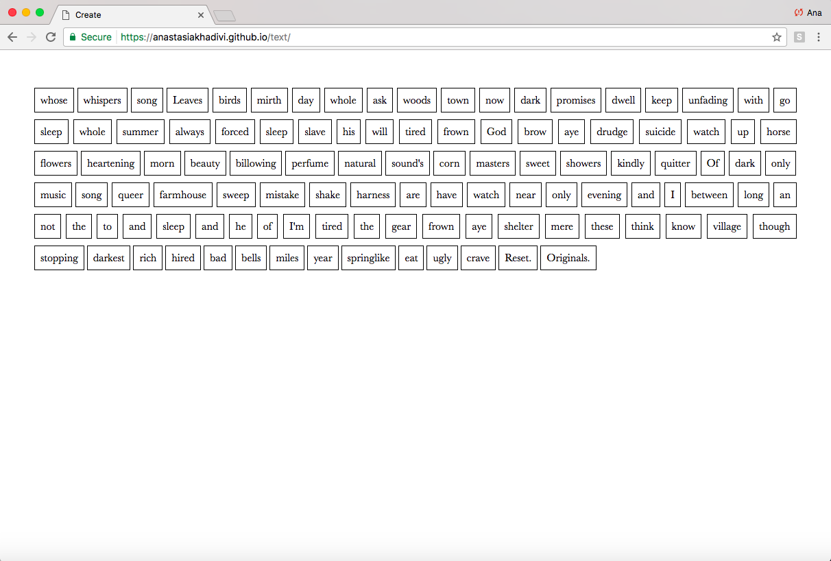 Everything on the page is usable for the user to create with. The two clickable items(“Reset.” and “Originals.”) on the screen are the last two items in the word bank. What separates them from the other is two things. The first, is that they are each punctuated with a period. The second is that the cursor changes when the user hovers over them, signaling that they are clickable. If the user chooses, they can also use these as part of their creation.